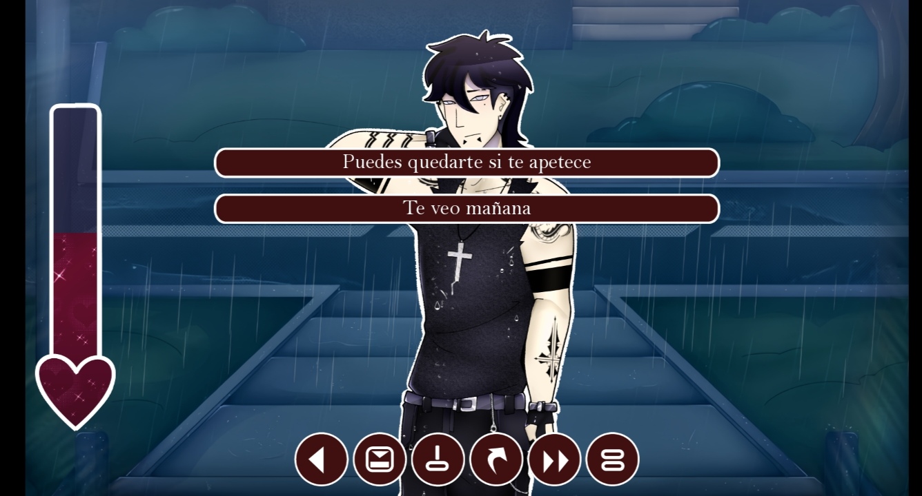 Super bueno!!!, me re gusta el camino al que va, y el como se puede interactuar de ves en cuando en medio de la historia, una observación mía es que sería bueno que veas para cambiar en algún momento si puedes la ilustración de los botones para guardar o adelantar pq nose si solo soy yo pero no sé me hicieron muy intuitivos, SI HACES EL ARTE NSFW PORFA DE MIYU 🥹🥹